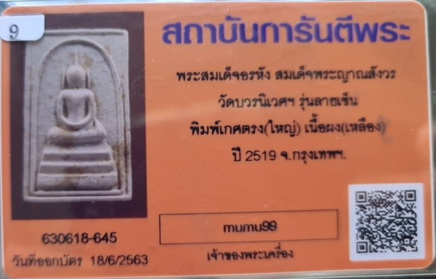 พระสมเด็จกรุวัดกลางคลอง จ.ราชบุรี พิมพ์ใหญ่ พระเกศทะลุซุ้ม บล็อกช่างหลวงวิจารณ์ เจียรนัย แตกกรุเมื่อ ปี 2516 บัตรรับรองสถาบันอื่น แม่เห็กดูดติด
