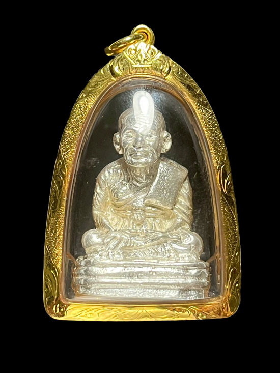 หลวงปู่ทวด วัดช้างให้ รุ่นกฐิน 42 พิมพ์เบตงเลขใต้ฐาน เนื้อเงิน ปี 2542 จ.ปัตตานี พร้อมเลี่ยมกรอบทองคำ จำนวนสร้าง 99 องค์ |