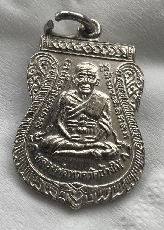 เหรียญเสมาหน้าเลื่อน หลวงปู่ทวด หลังพระนอน แจกปีนัง เนื้ออัลปาก้าชุบนิเกิล ปี 2508 |