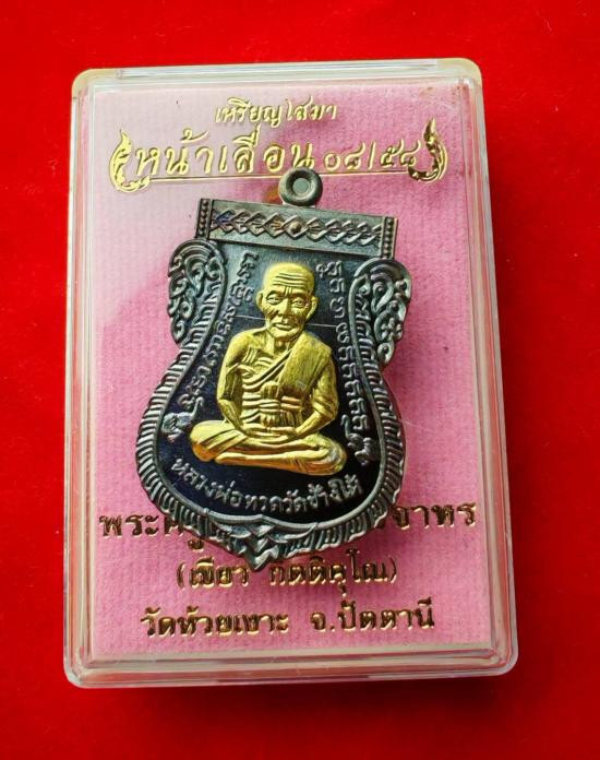 เหรียญเสมาหน้าเลื่อน 08/58 พ่อท่านเขียว วัดห้วยเงาะ ปัตตานี เนื้ออัลปาก้า หน้ากากทองคำ #73 พร้อมกล่องเดิมจากวัด |