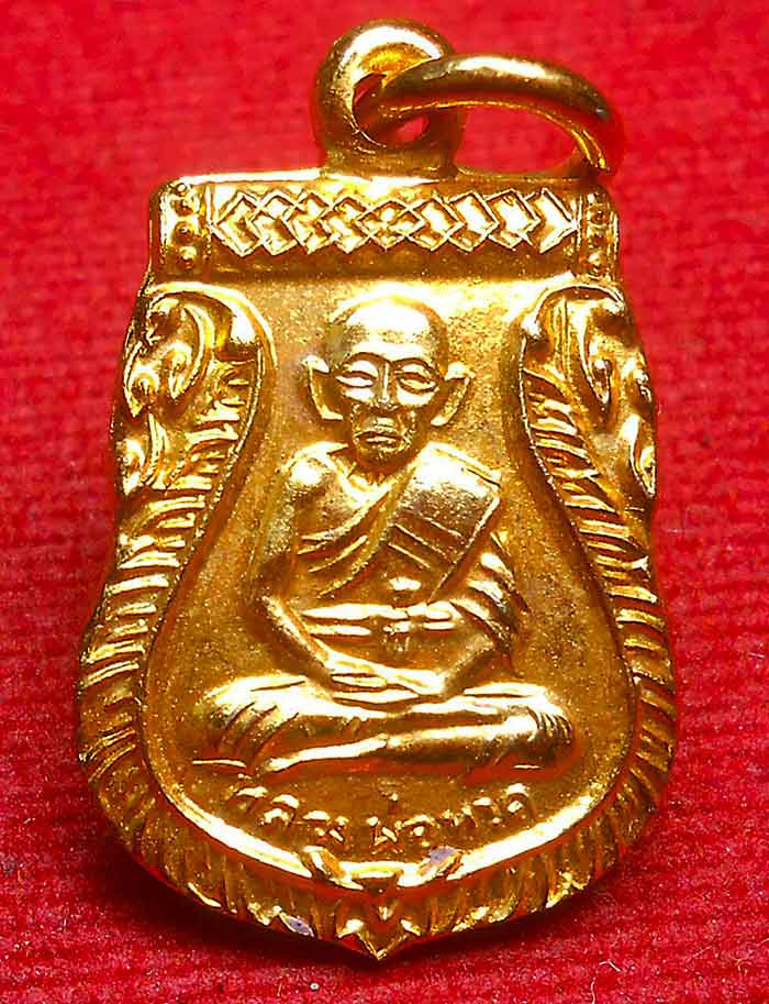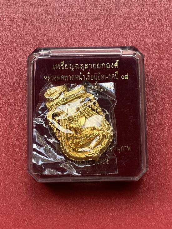 เคาะเดียวแดง หลวงปู่ทวด พิมพ์หน้าเลื่อน รุ่น เจริญพรสรงน้ำ เลข55 เนื้อ บรอนชุบทอง