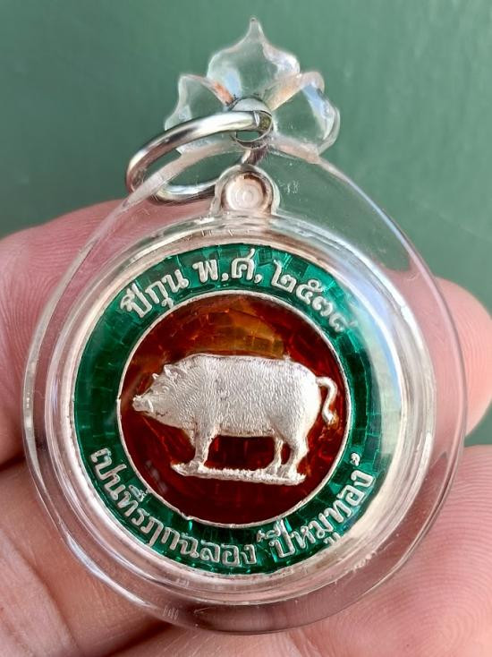 หมู มหาลาภ "หมูทอง" จัดสร้างในปี ๒๕๓๘ เนื้อเงินลงยา เขียว-แดง |