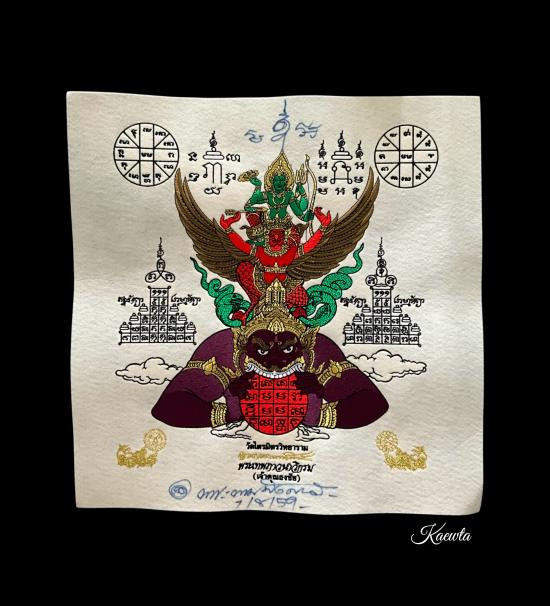 ผ้ายันต์ พระนารายณ์ทรงครุฑประทับบนพระราหู พร้อมลายเซ็นเจ้าคุณธงชัย |