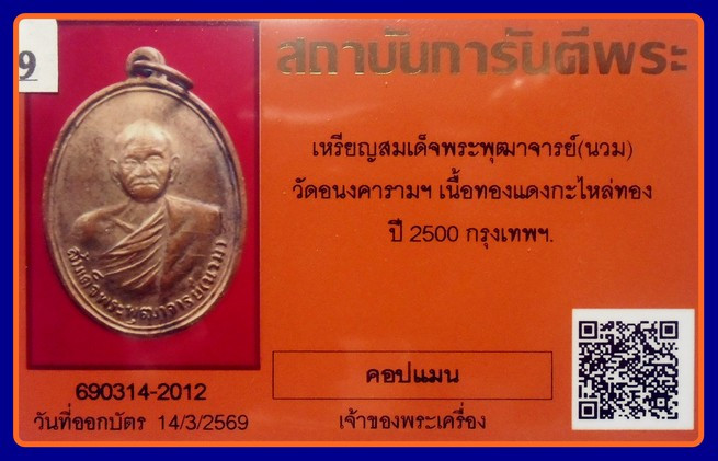 บัตรการันตี -800-ห่วงเชื่อมเดิม เหรียญสมเด็จ พระพุฒาจารย์(นวม) วัดอนงคาราม จ.กรุงเทพฯ ปี 2500 กรุงเทพฯ |