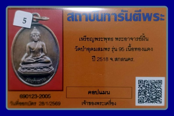 บัตรการันตี สวยมาก-800-เหรียญอาจารย์ฝั้น อาจาโร รุ่นที่ 95(พระเชียงแสน) พศ. 2518 เนื้อทองแดง |
