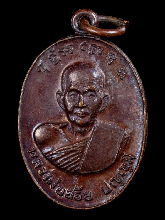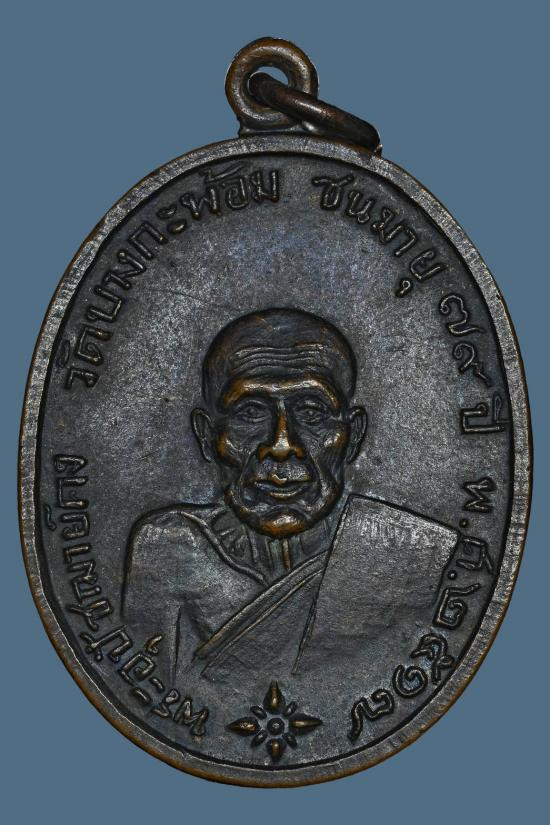 เหรียญหลวงพ่อกวย วัดโฆสิตราม รุ่น3 หลังยันต์ไตรสรณคม (รมดำ) ปี 2521 |