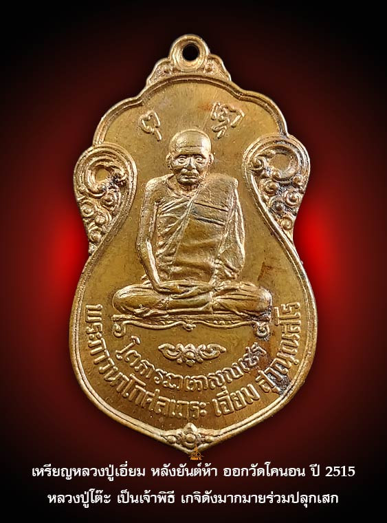 เหรียญหลวงปู่เอี่ยม วัดหนัง หลังยันต์ ห้า (สร้างน้อย) ออกวัดโคนอน ปี 2515 หลวงปู่โต๊ะ วัดประดู่ฉิมพลี เจ้าพิธีปลุกเสก และเกจิร่วมปลุกเสกมากมาย |