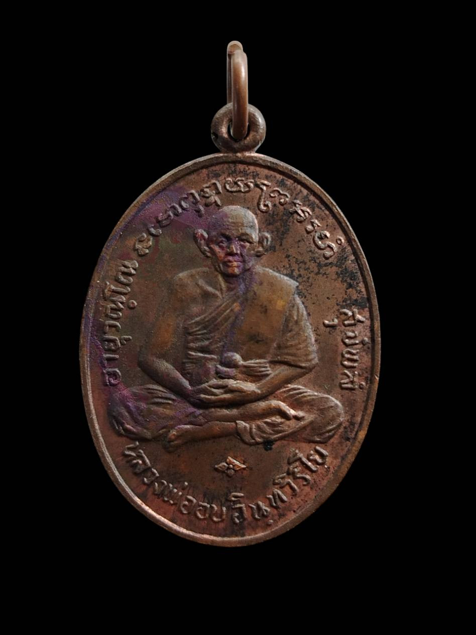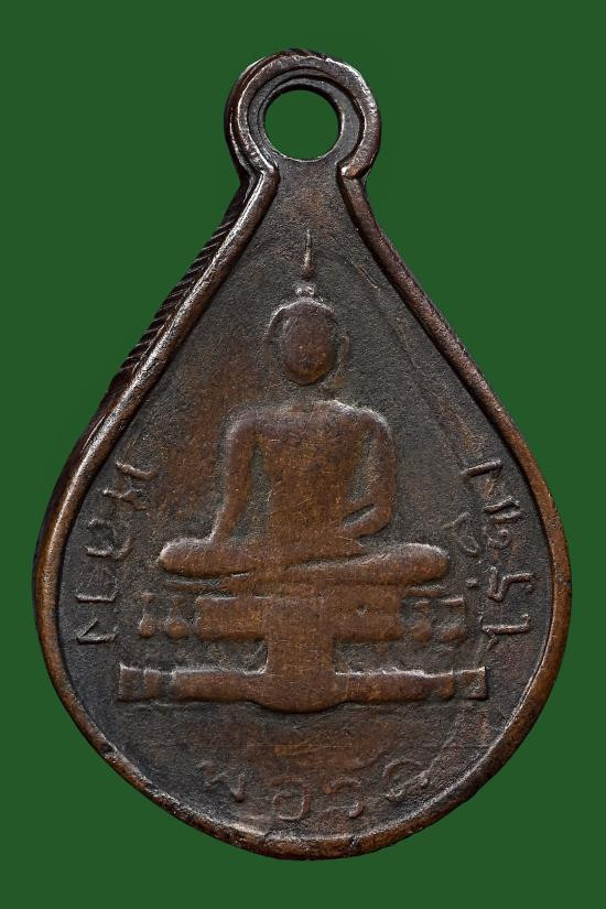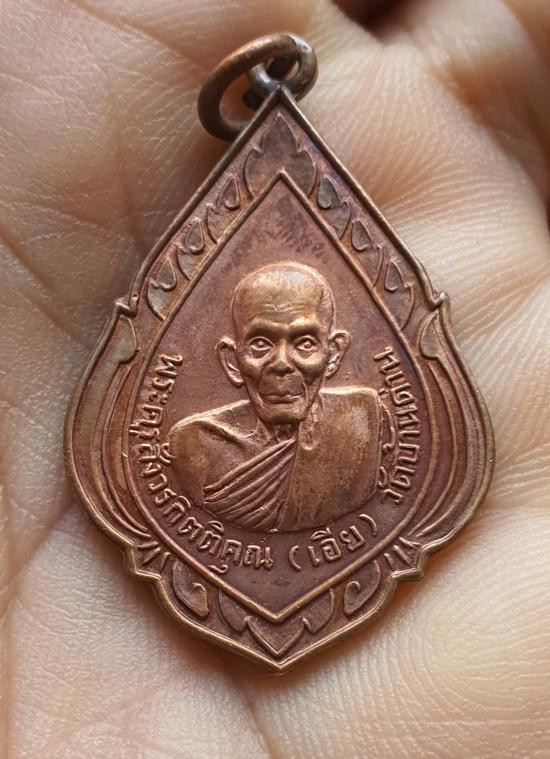 เหรียญหยดน้ำ หลวงพ่อเอีย วัดบ้านด่าน จ.ปราจีนบุรี รุ่น 8 หลังพระพุทธ ปี 2514 เนื้อทองแดงผิวไฟ |