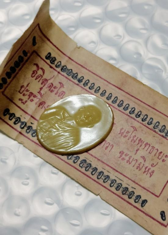 เหรียญพลาสติกหลวงพ่อโอภาสี หลังยันต์สวัสดิกะ สีขาวงาช้าง รุ่นแรก พ.ศ.2495 พร้อมเเผ่นยันต์ |
