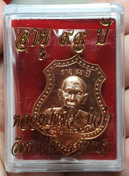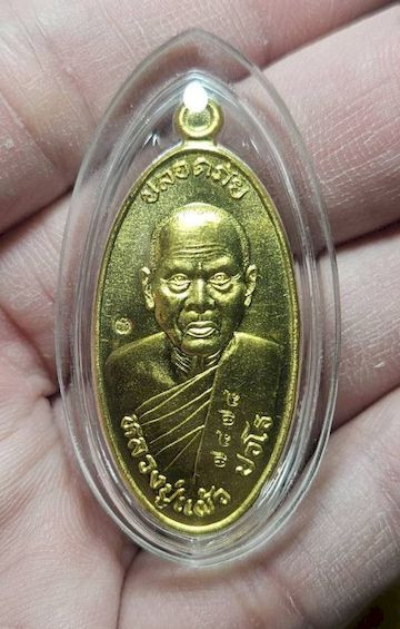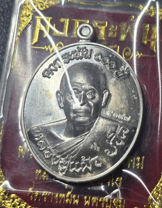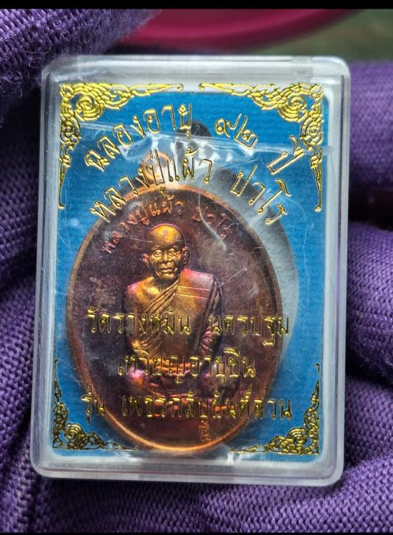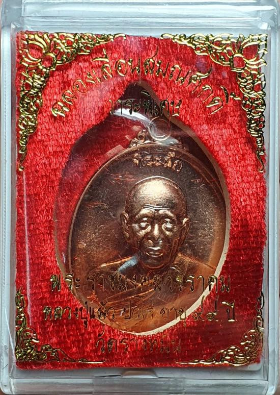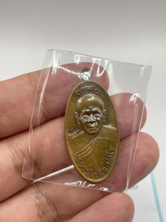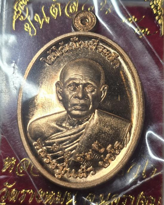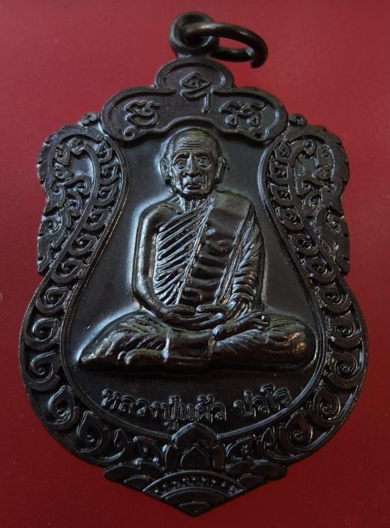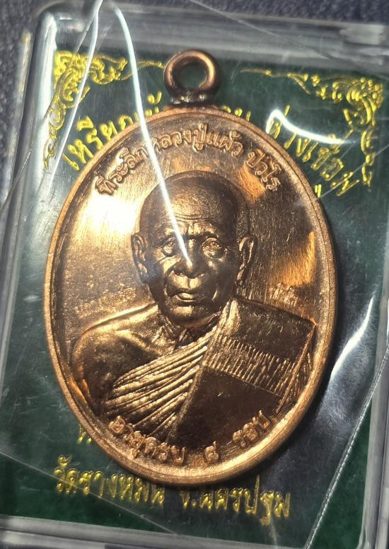 เหรียญนั่งพาน หลวงปู่แผ้ว ปวโร ฉลองอายุ 85 ปี เนื้อทองแดง วัดรางหมัน ปี 51 |