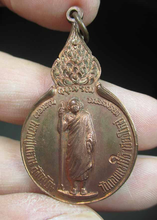 เหรียญยืนถือไม้เท้าหลวงปู่แหวน สุจิณฺโณ หลังภปร. เนื้อทองแดง ปี2519 |