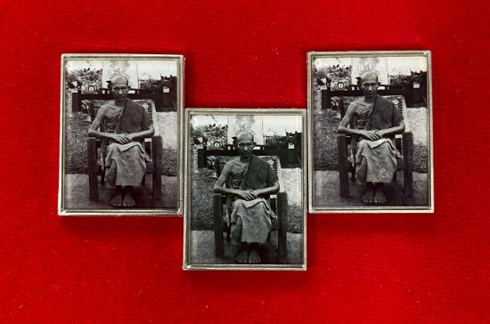 รูปถ่ายอัศวินขาปิ่นโต หลวงพ่อเกษม เขมโก จังหวัดลำปาง หลังอลูมิเนียม ด้านบนตอกโค๊ต โชคดี (1กระดาน 3 รูป) |