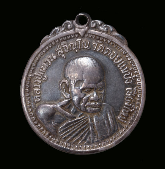 เหรียญยืนหลังพระปรมาภิไธยย่อ ภ.ป.ร. หลวงปู่แหวน สุจิณฺโณ วัดดอยแม่ปั๋ง อ.พร้าว จ.เชียงใหม่ ปี 2519 |