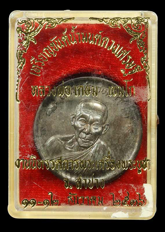 หลวงพ่อเกษม ชุดกล่องที่ระลึกทอดผ้าป่าสามัคคี กรุงเทพ-ลำปาง ในกล่องประกอบด้วย 1.เหรียญแตงโมหลวงพ่อเกษม 2.เหรียญครูบาบุญเย็น 3.เหรียญหลวงปู่แหวน (หาย) |