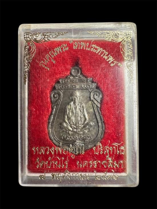 เหรียญหลวงพ่อคูณ วัดบ้านไร่ รุ่นนั่งพานชนะมาร เนื้อนวะโลหะ ปี 2537 เลี่ยมทอง พร้อมบัตรการรันตรีพระ |