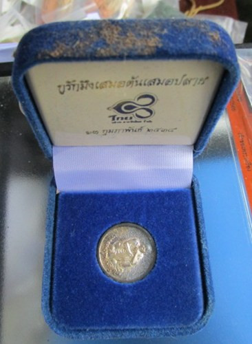 เหรียญนั่งพานชนะมาร หลวงพ่อคูณ วัดบ้านไร่ เนื้อทองแดง ปี 2537 หมายเลข 18144 สวยๆ พร้อมกล่องเดิม |