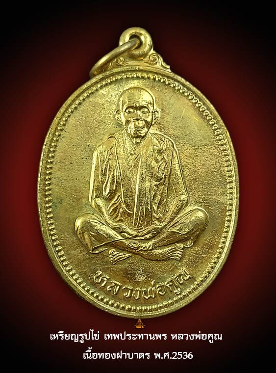 เหรียญรูปไข่ รุ่นคุณพระ"เทพประทานพร" หลวงพ่อคูณ ปริสุทฺโธ เนื้อทองฝาบาตร ปี พ.ศ.2536 |