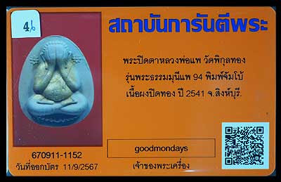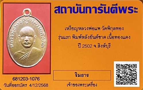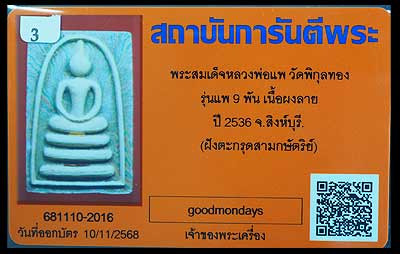 สมเด็จคะแนน แพพัน หลวงพ่อแพ วัดพิกุลทอง สิงห์บุรี พ.ศ.2510 + บัตรรับรอง G-Pra |
