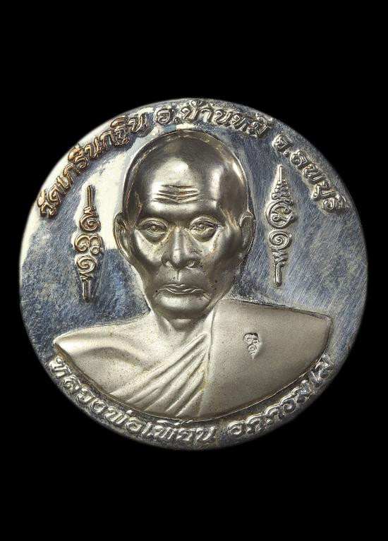 หลวงพ่อเพี้ยน วัดเกริ่นกฐิน รุ่นเพชรกลับทรัพย์ทวีเพิ่มพูน ฐานวงเดือน เสกไตรมาส ปี 55 เนื้อเงิน หมายเลข ๒๐๘๘ |
