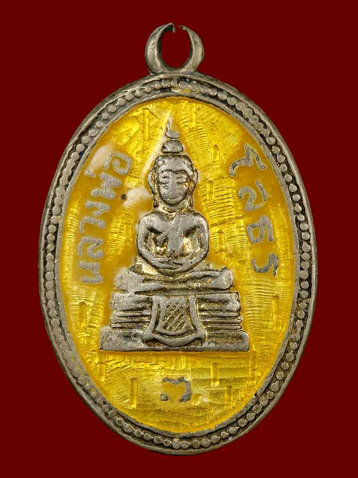 วัดใจ เหรียญหลวงพ่อโสธร ปี2511 เนื้อเงินลงยาสีเหลือง สภาพใช้สึก หูเหรียญขาดด้านบน |