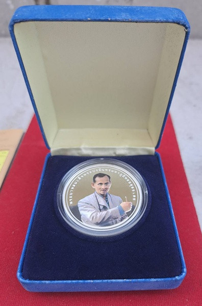 เหรียญเนื้อเงิน ที่ระลึกพระราชพิธีถวายพระเพลิงพระบรมศพ ร.9 ตลับพลาสติกใส และใบเซอร์ครบชุด เหรียญ ผ่าศูนย์กลาง 35 มม. โลหะเงินร้อยละ 92.5 นน.22 กรัมครับ |