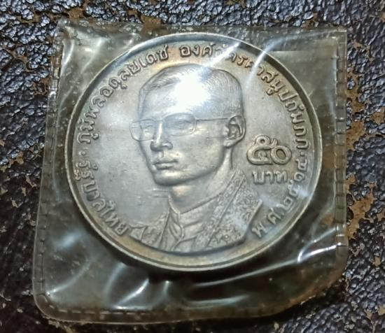 เหรียญแสตมป์ในหลวง ร.9 เนื้อเงินบริสุทธิ์ ชุบทองคำสวิส 999.9 ที่ระลึกในงานฉลองศิริราชสมบัติครบ 50 ปี |