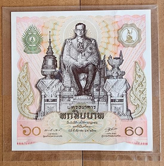 วัดใจ...ให้จริง บัตรธนาคาร ๖๐ บาท สภาพใหม่ไม่ผ่านการใช้งาน เป็นธนบัตรที่ระลึกที่ออกโดยธนาคารแห่งประเทศไทย เพื่อเฉลิมพระเกียรติพระบาทสมเด็จพระบรมชนกาธิเบศร มหาภูมิพลอดุลยเดชมหาราช บรมนาถบพิตร (ร.๙) |
