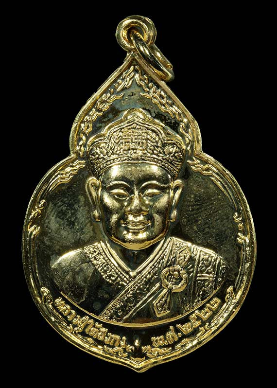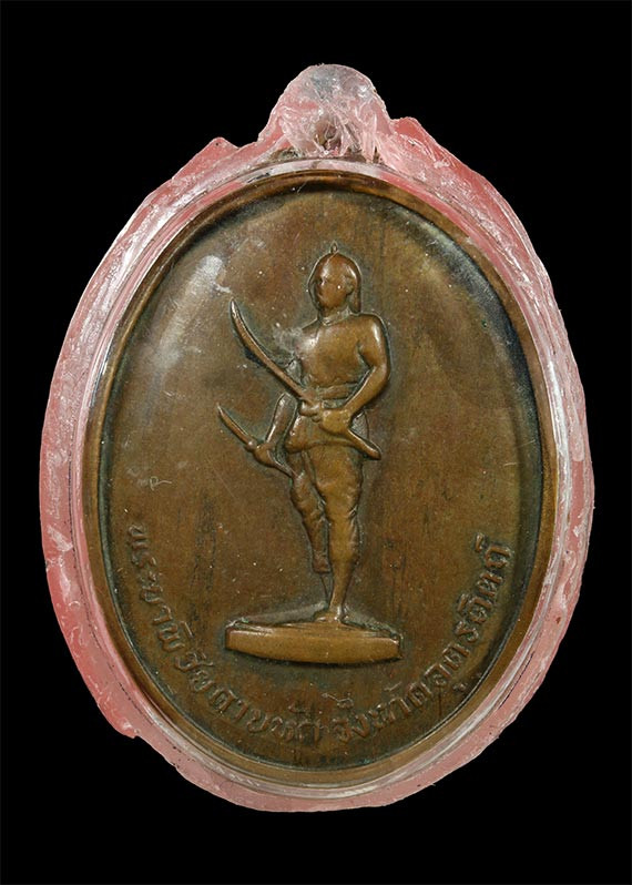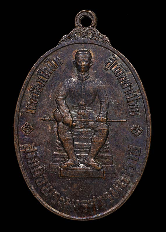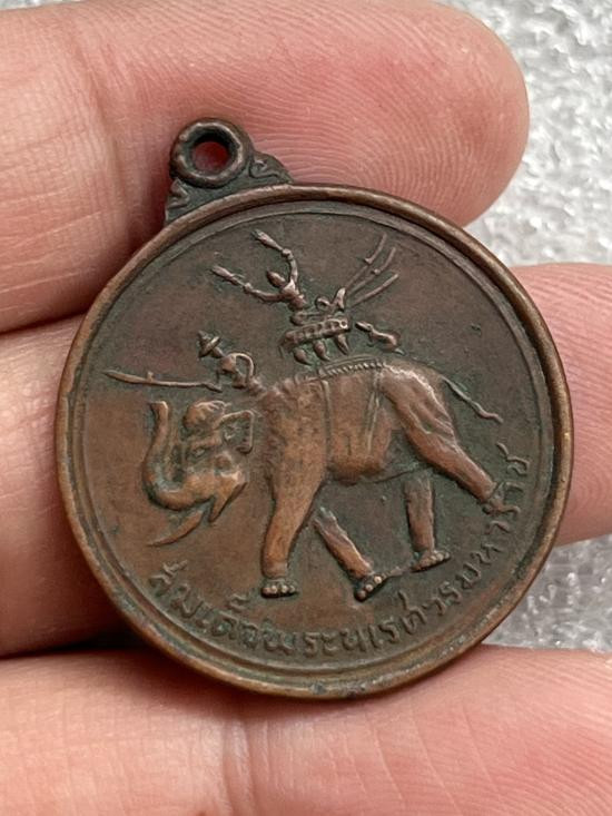 เหรียญสมเด็จพระนเรศวรมหาราช หลังอนุสรณ์ดอนเจดีย์ เนื้อทองแดงรมดำ ปี 2513 หลวงพ่อมุ่ยและเกิจสายสุพรรณร่วมปลุกเสก |
