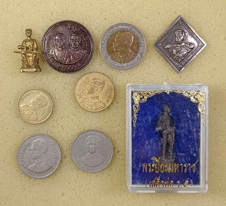 รูปหล่อสมเด็จพระนเรศวรมหาราช + เหรียญพระเจ้าตากสินมหาราช + เหรียญ + รูปหล่อยืน ร.5+ เหรียญกรมหลวงชุมพรฯ + เหรียญร.9 4 เหรียญ |