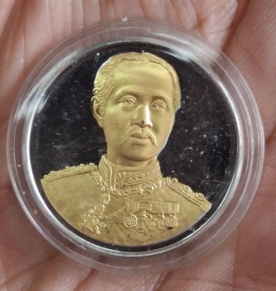 เหรียญร.5(คามิโอ)เนื้อเงินบริสุทธิ์999ขัดเงาอาบทองคำบางส่วน วาระสร้างอาคารกาญจนาภิเษกในหลวงร.9 รพ.เลิดสิน |