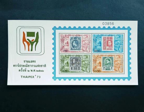 แสตมป์แผ่นชืทที่ระลึก ชุดสอง ปี 2516 พิมพ์พระรูป ร.5 ร.6 ร.7 ร.8 (Souvenir Sheet THAIPEX 1973) ชุดงานแสดงตราไปรษณียากรแห่งชาติ ครั้งที่ 2 4 ส.ค. 2516 แบบไม่ปรุรู รอยปรุที่แสดงด้านหน้าเป็นภาพพิมพ์ |