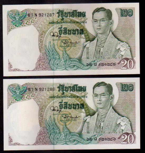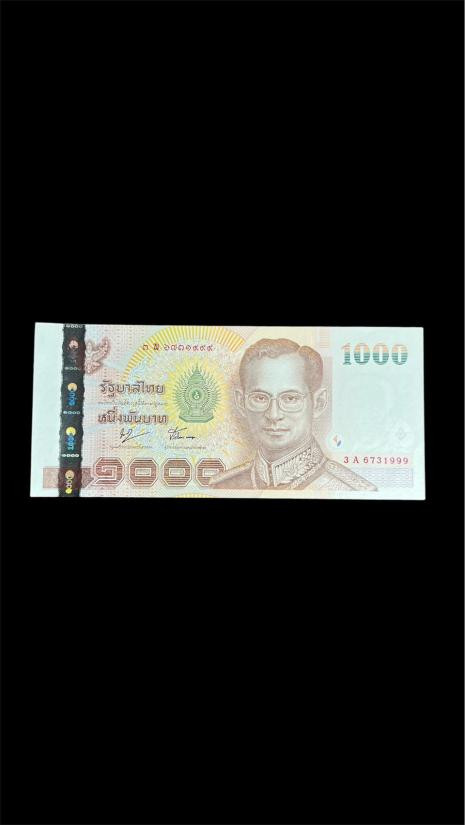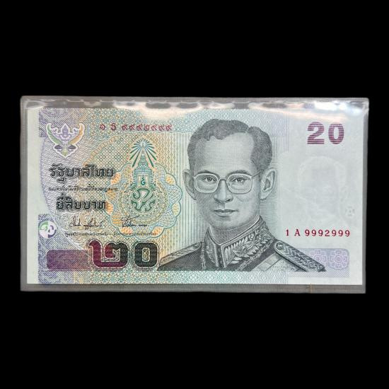 แบงค์ 20 บาท แบบ 15 รุ่นที่ 1 ซึ่งเป็นธนบัตรหมุนเวียนในรัชกาลที่ 9 ออกใช้เมื่อปี พ.ศ. 2546 เลขสวย 1A(ธ) 9992999 UNC |