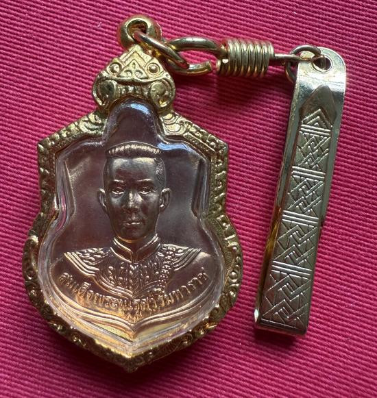 เหรียญสู้ สมเด็จพระนเรศวรมหาราช เนื้อทองแดงกรอบและแหนบชุบทอง |