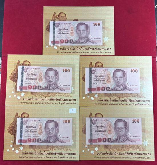 ธนบัตร 100 บาท รัชกาลที่9 ที่ระลึกครบ 60 ปี วันบรมราชาภิเษกและวันราชาภิเษกสมรส จำนวน 5 ใบ +ปก สภาพใหม่สวยตามรูป |