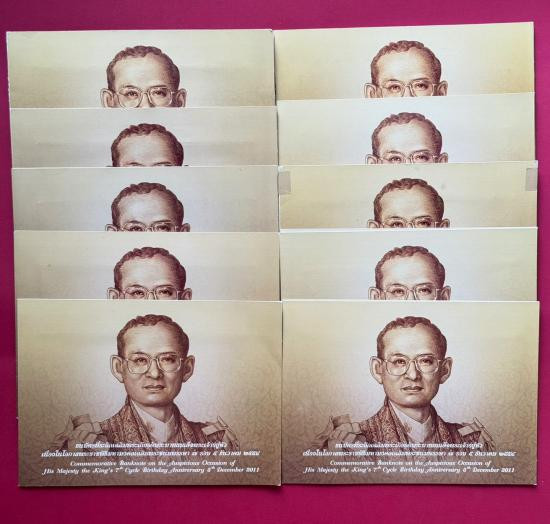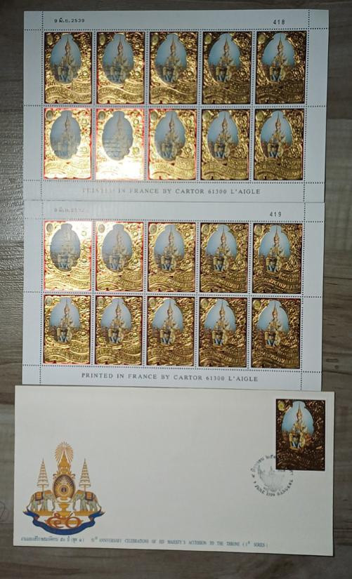 แสตมป์ที่ระลึกงานฉลองสิริราชสมบัติครบ 50 ปี พระบาทสมเด็จพระเจ้าอยู่หัวภูมิพลอดุลยเดช เป็นแสตมป์ใหม่ที่ยังไม่ผ่านการใช้ ราคาหน้าแสตมป์ดวงละ 100 บาท จำวน 21 ดวง |