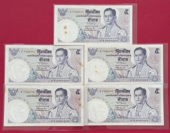 ธนบัตร รัชกาลที่ 9 แบบ 11 ชนิด 5 บาท หมวด S เลขเรียง จำนวน 5 ใบ สภาพสวยตามรูป |