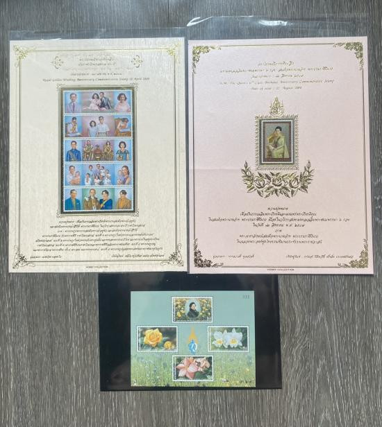 แสตมป์ชุด วันราชาภิเษกสมรส 50ปีพ.ศ.2543+ชิทแสตมป์ 70 พรรษาพระพันปีหลวง(พ.ศ.2545)+แสตมป์ทอง 6รอบ พระพันปีหลวง(พ.ศ.2547_หน้าดวง 100บ.) |