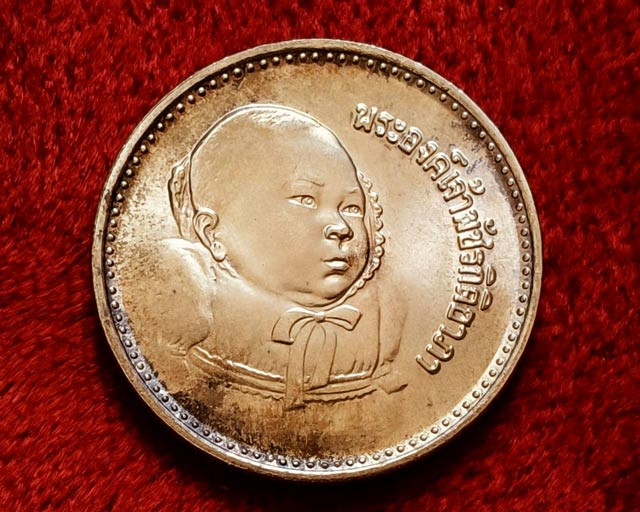 เหรียญกษาปณ์ที่ระลึกพระราชพิธีสมโภชเดือนและขึ้นพระอู่ พระเจ้าหลานเธอ พระองค์เจ้าพัชรกิติยาภา ราคาหน้าเหรียญ 200 บาท ออกปี 2522 |