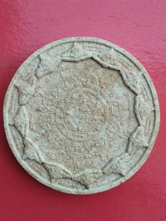 เคาะเดียวแดง สีผึ้งพระราหู รุ่น มงคลจักรวาล เนื้อ โลหะชุบทองลงยาสีดำขอบสีแดง ขนาด5ซม |