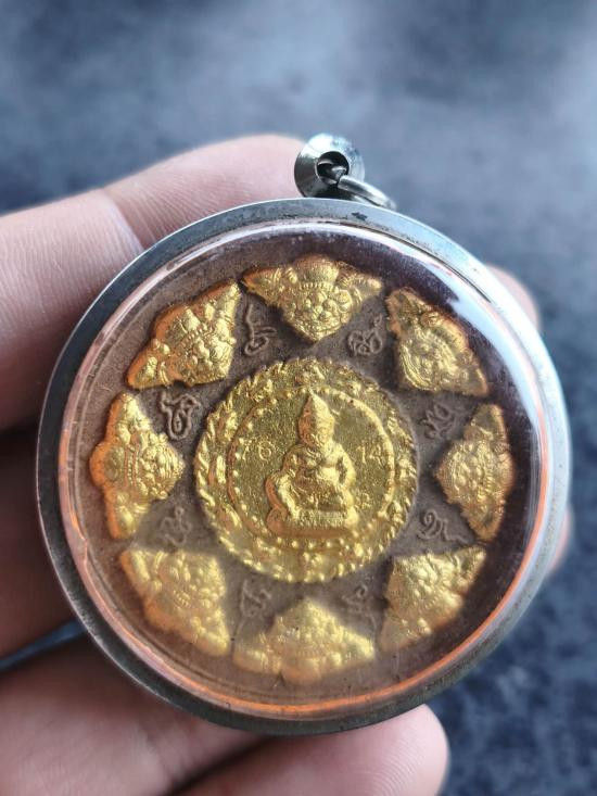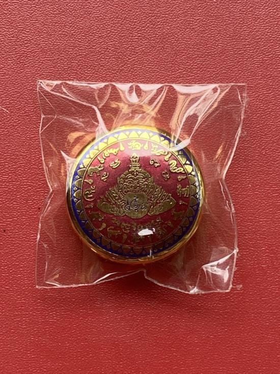 เคาะเดียวแดง สีผึ้งพระราหู รุ่น มงคลจักรวาล เนื้อ โลหะชุบทองลงยาดำขอบแดง ขนาด5.5ซม |