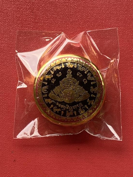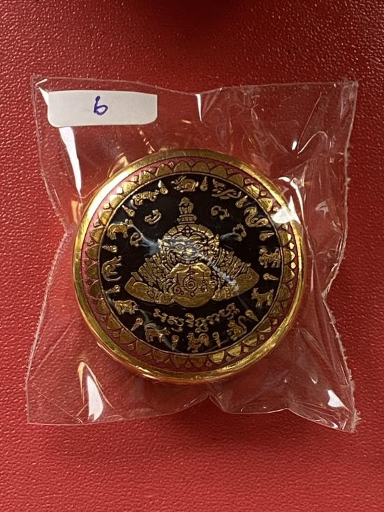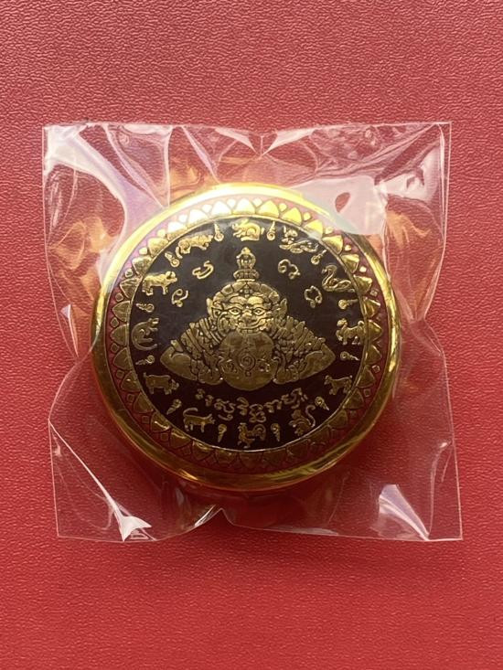 เคาะเดียวแดง สีผึ้งพระราหู รุ่น มงคลจักรวาล เนื้อ โลหะชุบทองลงยาสีดำขอบสีดำ ขนาด3.2ซม |