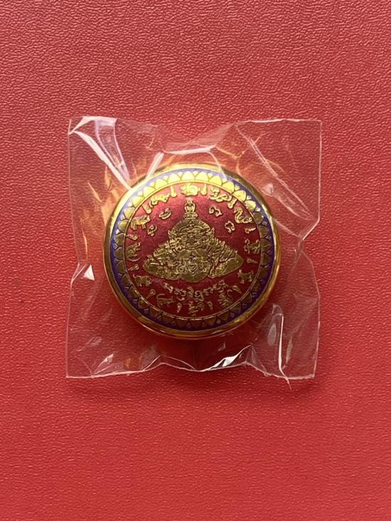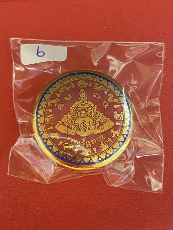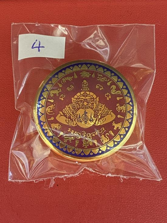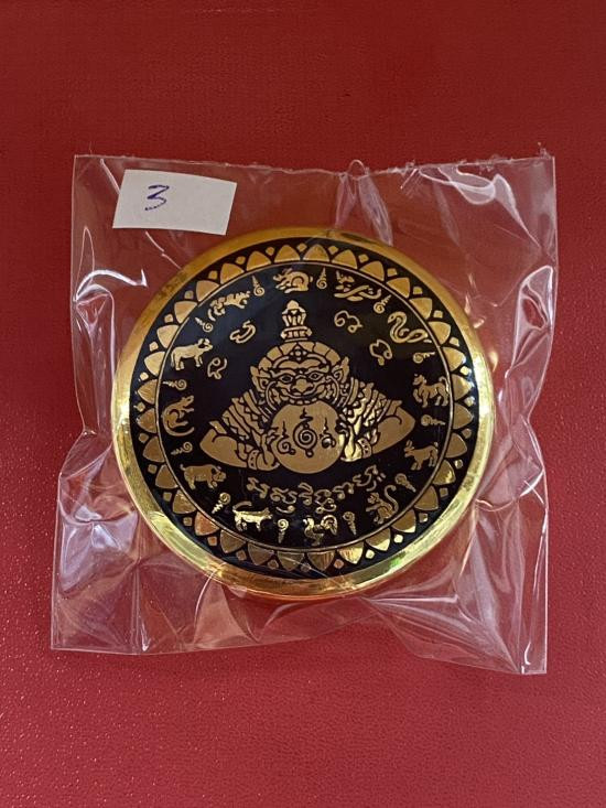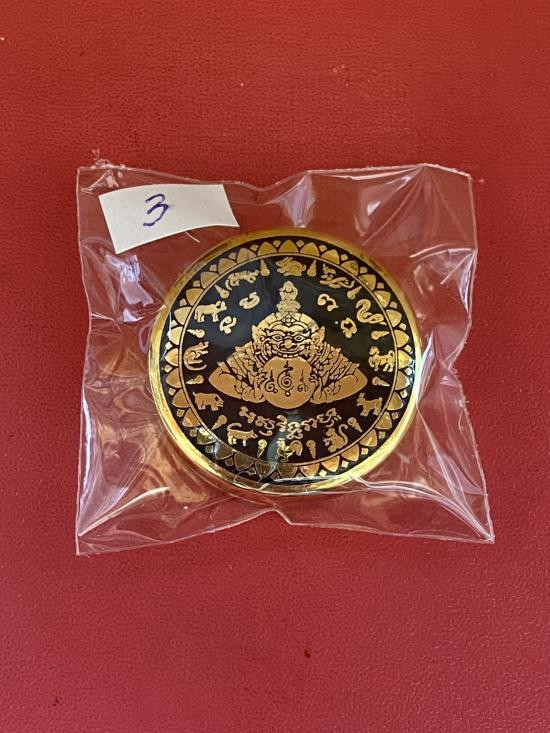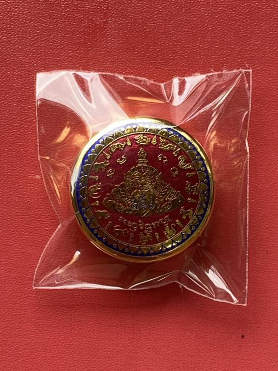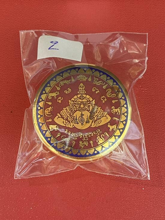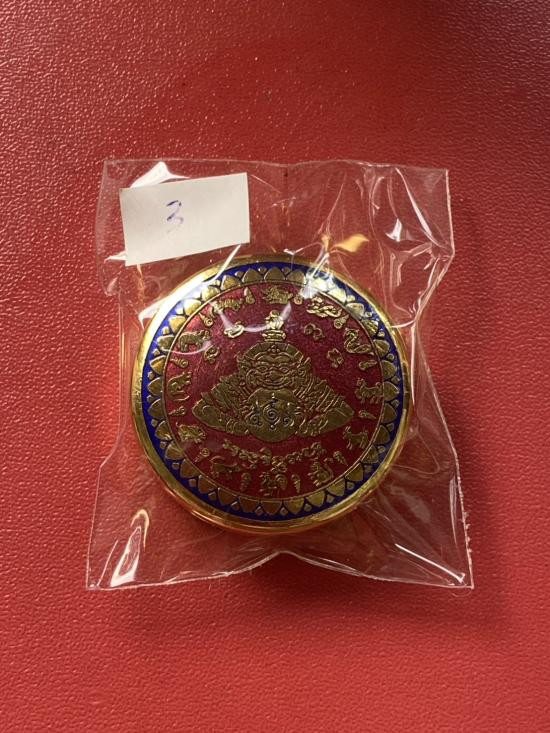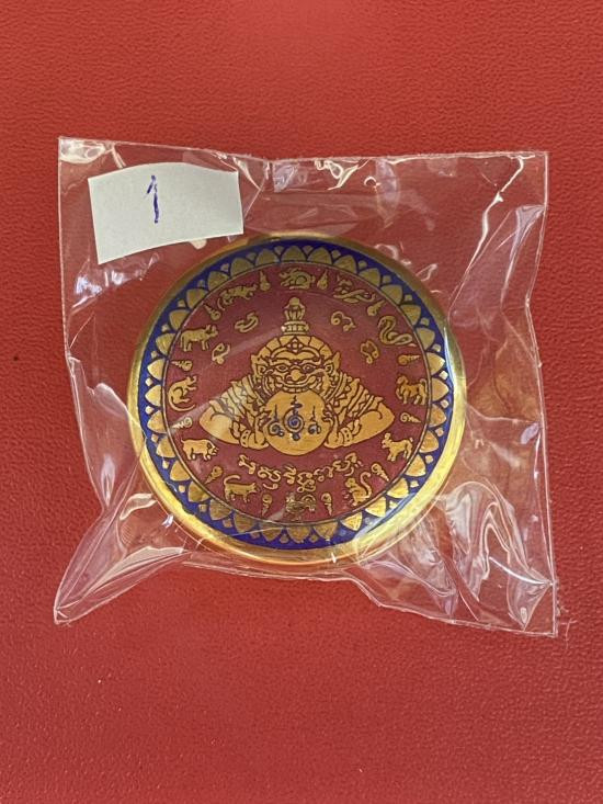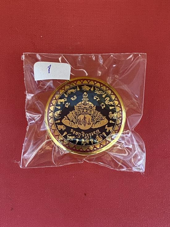 เคาะเดียวแดง สีผึ้งพระราหู รุ่น มงคลจักรวาล เนื้อ โลหะชุบทองลงยาสีดำขอบสีแดง ขนาด3.2ซม |
