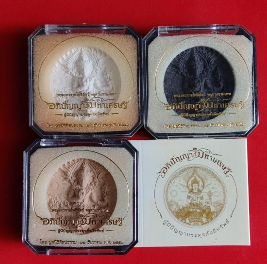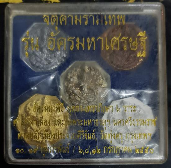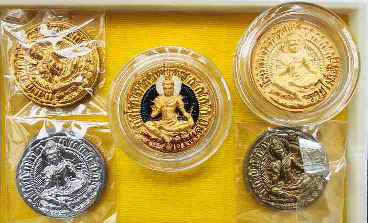 เหรียญจตุคามรามเทพ รุ่น " อัครมหาเศรษฐี " 1 ชุด ประกอบด้วย เหรียญชุบทองพ่นทราย ชุบเงินพ่นทราย เนื้อตะกั่ว เนื้อแร่ผสม และเนื้อทองแดง พิมแปดเหลี่ยม มีโค้ชทุกเหรียญ ขนาด 3.5 cm พร้อมกล่อง |