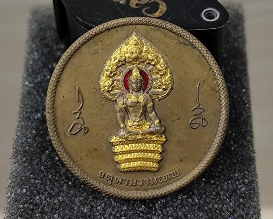 เหรียญบาตรน้ำมนต์เนื้อชุบทอง จตุคามรามเทพ หลัง พระปิดตาพังพระกาฬ รุ่นอัครมหาเศรษฐี วัดพระมหาธาตุวรมหาวิหาร |