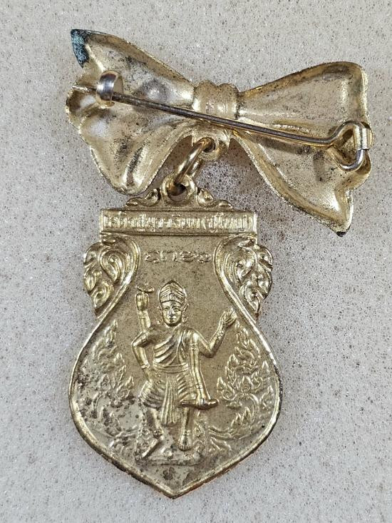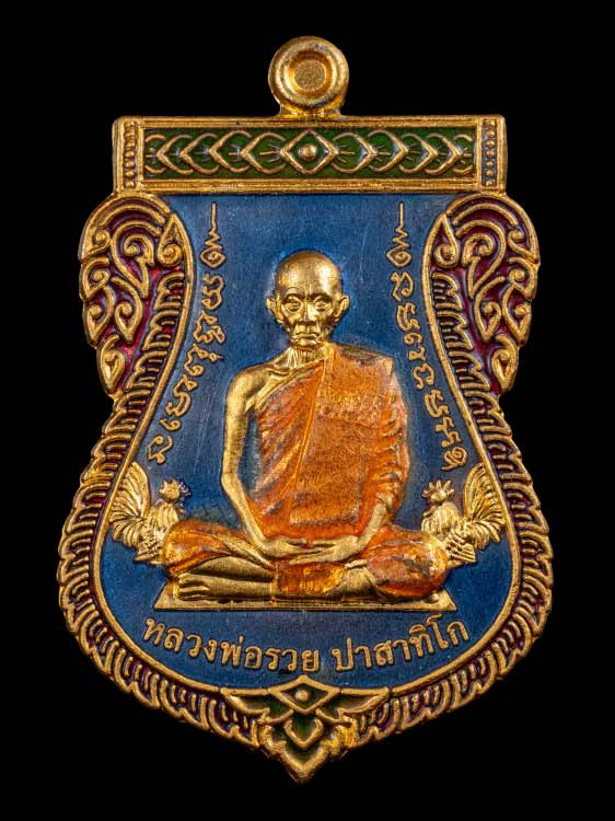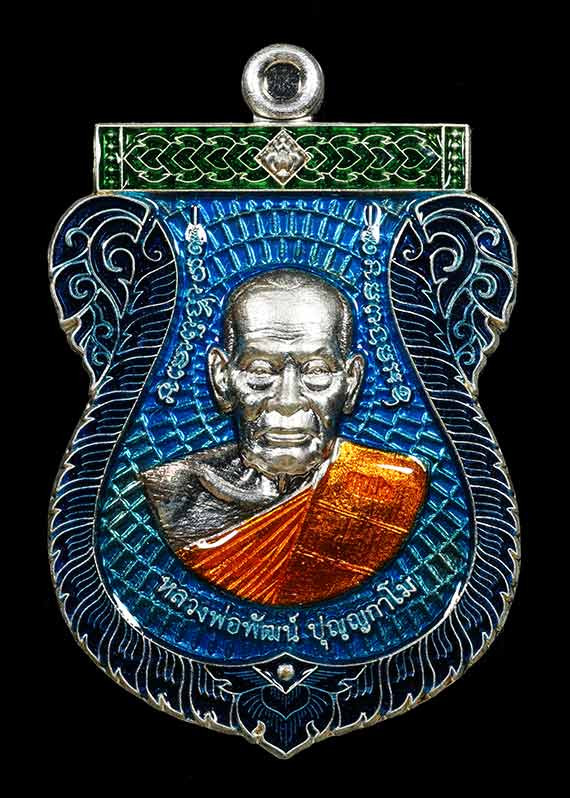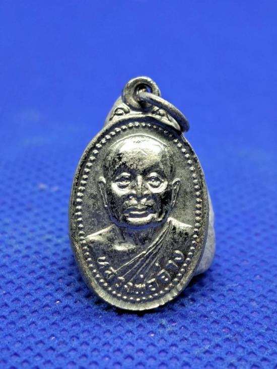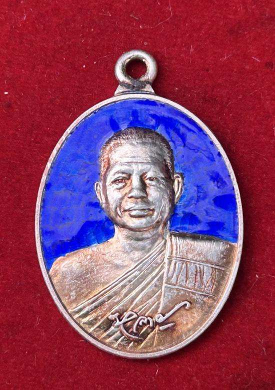 เหรียญห่วงเชื่อมรุ่นแรก หลวงพ่อหลาย วัดคันลัด จ.สมุทรปราการ เนื้อเงินลงยาน้ำเงินมีจาร |