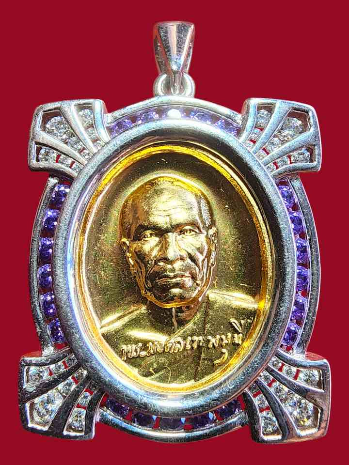เหรียญหลวงพ่อจาด วัดบางกระเบา หลังปิดตา จ.เจริญลาภ ปี๔๐ (ย้อนยุครุ่นแรก) เนื้อเงินลงยา หน้ากากทองคำ |