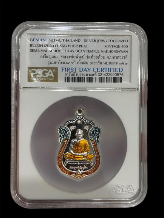 *** แดงเคาะแรก พระบ้านเหมามา *** เหรียญเสมา รุ่นมหาโชค 100ปี เนื้อเงินลงยาส้ม เลข.392 |