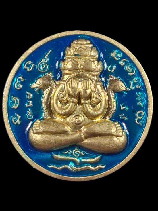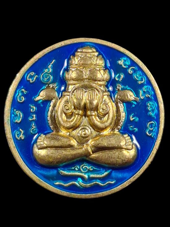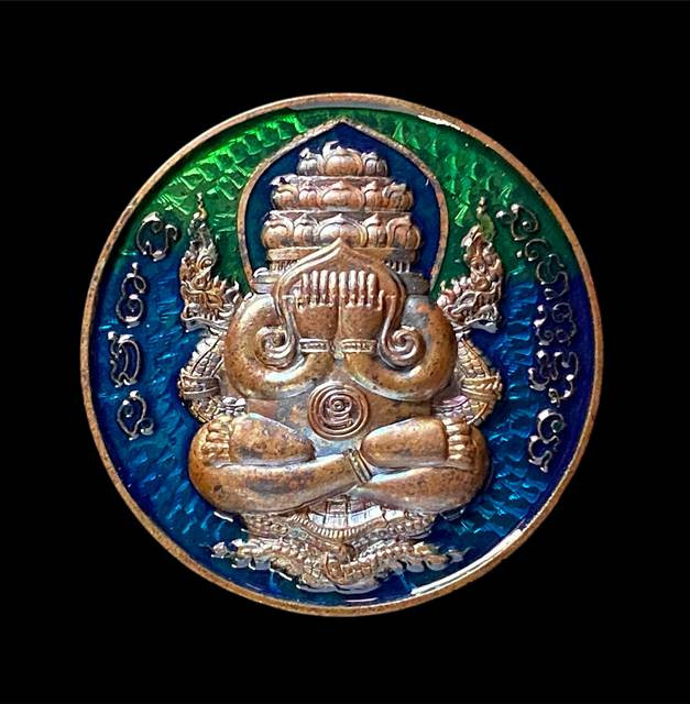 เหรียญปิดตาพระโพธิสัตว์พังพะกาฬ เนื้อเหรียญลงยาสีดำกะไหล่ทอง เลข590 ตอกสองโค๊ตแยกชุดพิเศษกรรมการ 9 รอบ 9 พิธี 108 ปี ท่านขุนพันธ์ จ.นครศรีธรรมราช ปี 2549 |