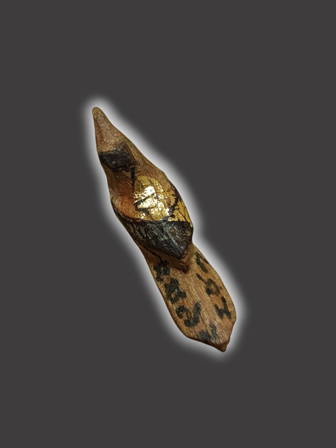 A5370.เครื่องรางของขลัง ไม้เเกะ นกสาริกาเล็ก จารย์ยันต์ ปิดทอง ไม่ทราบที่ เคาะเดียวเเดง |
