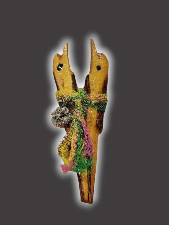 A5372.เครื่องรางของขลัง ไม้เเกะ สาริกาคู่ พันผ้าสี ไม่ทราบที่ เคาะเดียวเเดง |